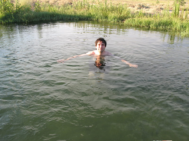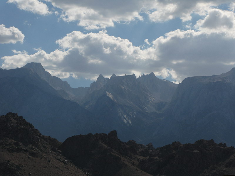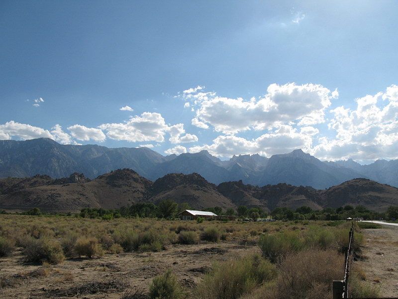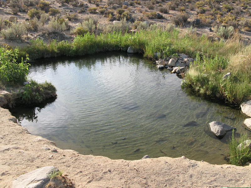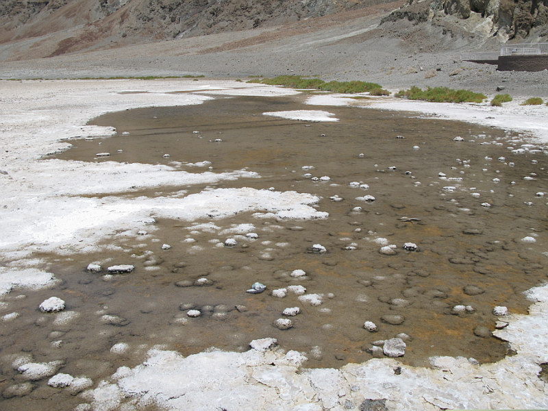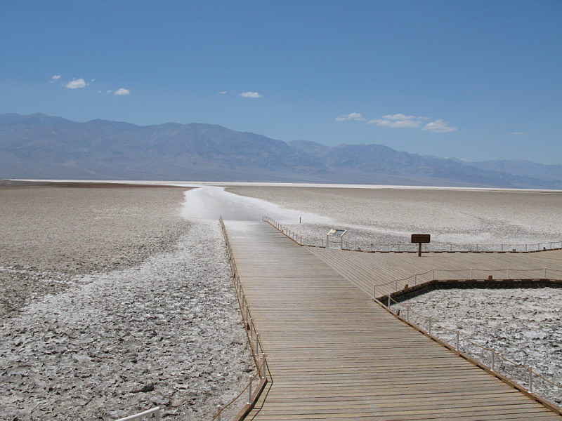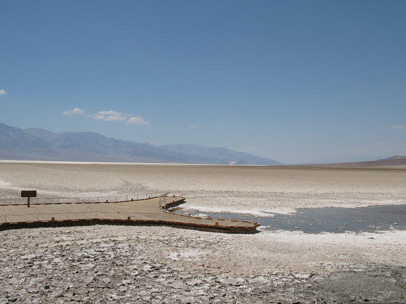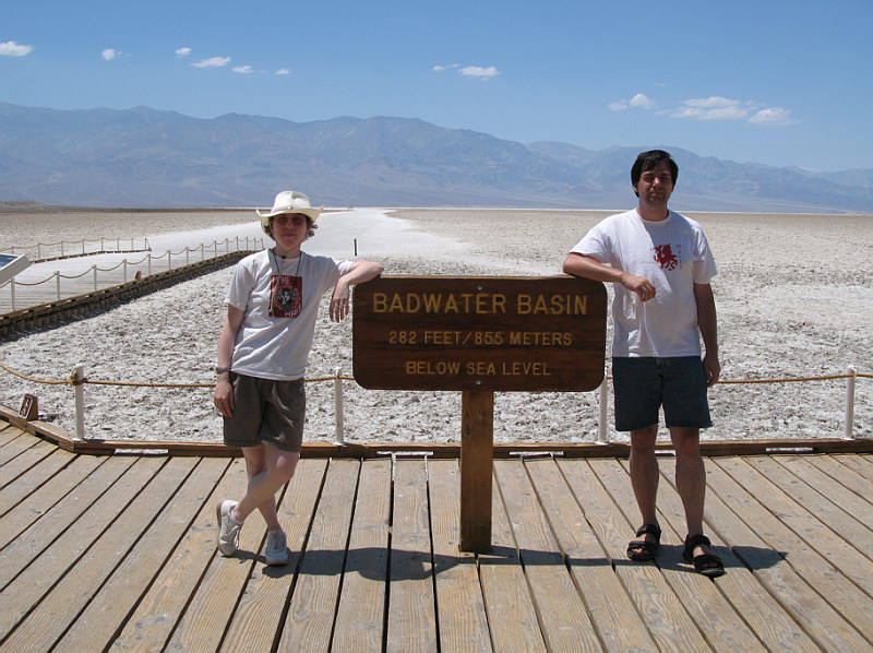In the morning we packed and made our way back over the roads that aren’t meant for a Saturn Ion, up to the main Ranger Station. We paid our admission fee and chatted with the Rangers some. We found out that entry receipts to National Parks could be used towards the $80.00 annual Parks Pass that gives you free admission to all Nation Parks and Monuments for a whole year. We did some quick math and discovered we’d already come pretty close to spending that much and we still had a couple more parks to hit – that was exciting news indeed! :) I’ll make a quick comment here that Death Valley in July really is no walk in the park. By 9:00 the temperature in the shade was 110 degrees and when we filled our water jugs at one of the ubiquitous spouts, the water was hot enough to nearly scorch you! Still, we were having fun and were eager to get down to Badwater – the lowest spot in the USA: an impressive 282 feet BELOW sea level. Badwater is situated in the middle of a barren salt flat that ironically, really does have small pools of water; it’s just very saline (hence the name). After snagging some quick pics, we hightailed it back to the car and out of Death Valley. There were a couple tense moments as the car made the climb out of the valley – we were watching, with growing worry, the temperature gage slowly creep up towards the red zone. Right when I was about to suggest to Rick that maybe we should pull over and let the engine cool, we crested the hill and the temp went back to normal in a matter of minutes. “I see why they call it Death Valley!” was a frequent joke among us. With desolate Death Valley behind us we were pleasantly shocked to find the beauty and splendor of the Sierra Nevadas in front of us. Never before had I seen such incredibly stunning mountains – stark, sere granite spires rising up and up to the deep blue sky. Truly a site to behold! With these amazing mountains as a backdrop, we stopped off at a set of hot springs we’d read about from a book on hot pools and springs of the Southwest that Rani had loaned us. It was rather fun taking a dip in warm water that was there of its own accord. After that we drove through a rather impressive dust storm on or way to the town of Bishop, where we stopped for the night. |