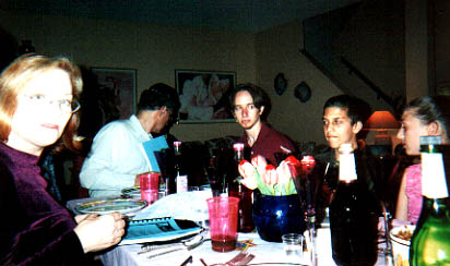Thursday I watched more movies, talked on the Internet and slept some. That evening Dan, Troy, their dad, step mom and I went over to Seth's family gathering for Passover. It was a fun evening and it was kewl to see how Jewish people celebrate Passover. There were around 17 people at this family gathering. All of us got little booklets that we went through before dinner with rituals for Passover. Things like lifting and sipping from wine glasses at certain times, dipping parsley into salt water and eating it. Eating the bitter herbs and stuff along those lines. It was neat because the booklet described why we were doing these things and where the rituals came from.